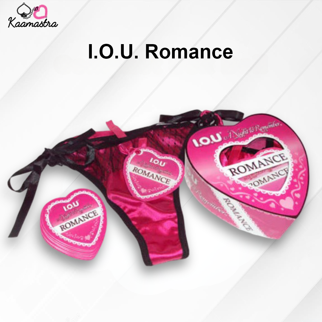 Looking to add some passion and intimacy to your love life? Make it a night to remember with our Romance IOU invitation panty -- the perfect way to initiate your next sexual encounter. Simply slip on these sexy panties and tie one or more IOU's to the front bow. Ask your lover to open a Romance IOU to reveal another wild surprise! Panty is made of anti-static, breathable satin with flirty self-tie satin ribbon sides and a front satin bow detail. Packaged in an adorable heart-shaped box.