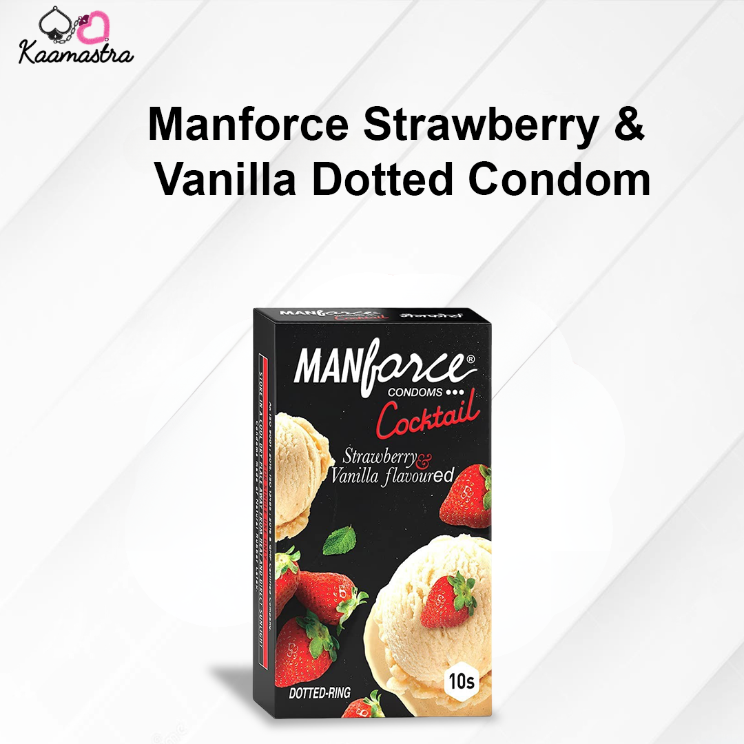 Manforce Strawberry & Vanilla Dotted-Ring Cocktail Condom is a lubricated condom with strategically placed raised dots for increased stimulation and deeper sexual response. Designed for both pregnancy prevention and protection against sexually transmitted diseases. Features easy application, dependable protection, and a friction-free experience.